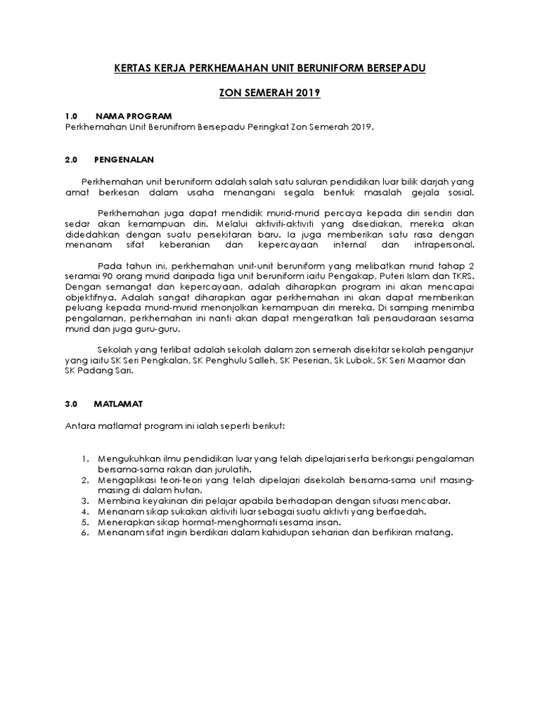. Kertas kerja program perkhemahan perdana unit beruniform peringkat kampus 2021 tarikh. KERTAS KERJA PERKHEMAHAN PERDANA UNIT BERUNIFORM KALI KE-16 SMK TAMAN TUN FUAD KOTA KINABALU TAHUN 2017 10 PENGENALAN Perkhemahan Perdana Unit. KERTAS KONSEP PERKHEMAHAN BADAN BERUNIFORM SEKOLAH SEKOLAH KEBANGSAAN TITI TOK BANDAR PERLIS 2012 1.